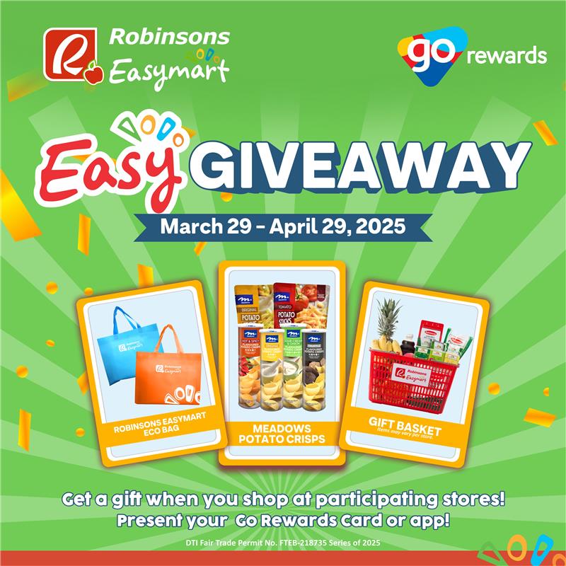 - Purchase the required single-receipt minimum spend in any participating Robinsons Easymart store. Present your Go Rewards Card and the Easy Giveaway Stamp Card (for customers who already have the First Stamp) to claim the corresponding prizes. Only one stamp per day can be redeemed.